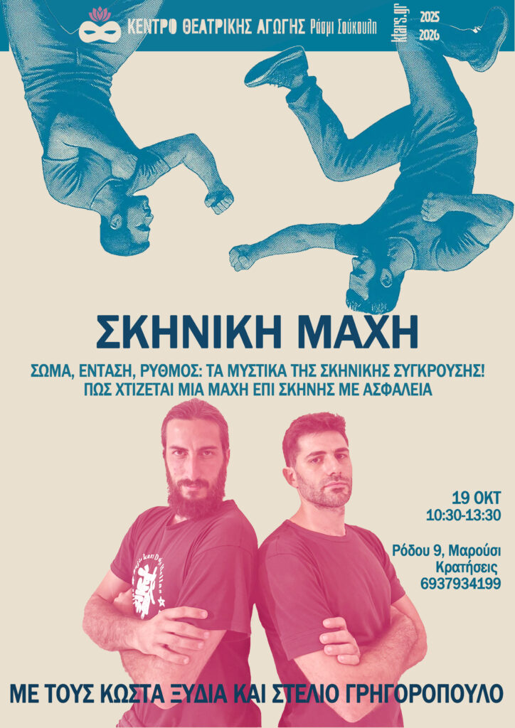 Στις 19 Οκτωβρίου, σε ένα τρίωρο θεατρικό σεμινάριο δράσης, οι Κώστας Ξυδιάς και Στέλιος Γρηγορόπουλος μάς εισάγουν στον κόσμο της σκηνικής μάχης και μας καθοδηγούν βήμα-βήμα στο πώς χτίζεται μια σκηνή σύγκρουσης με αληθοφάνεια, ένταση και απόλυτη ασφάλεια.